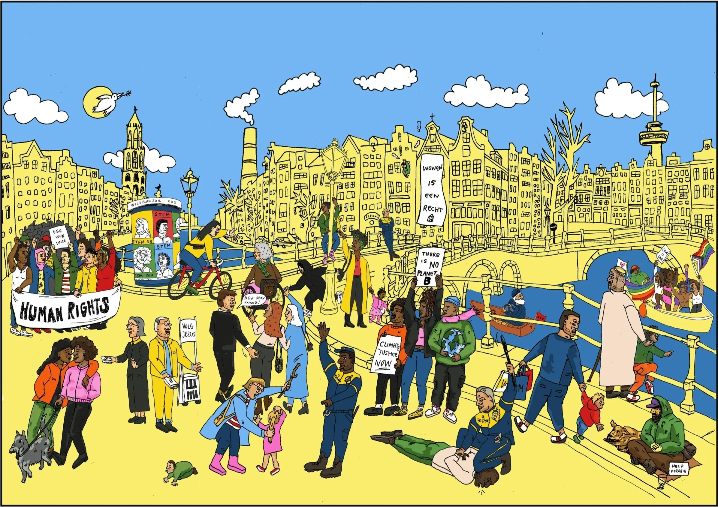 Amnesty International asked me to create an illustration about human rights for their youth program in Amsterdam. This illustration showcases some examples of human rights and how some are being violated.